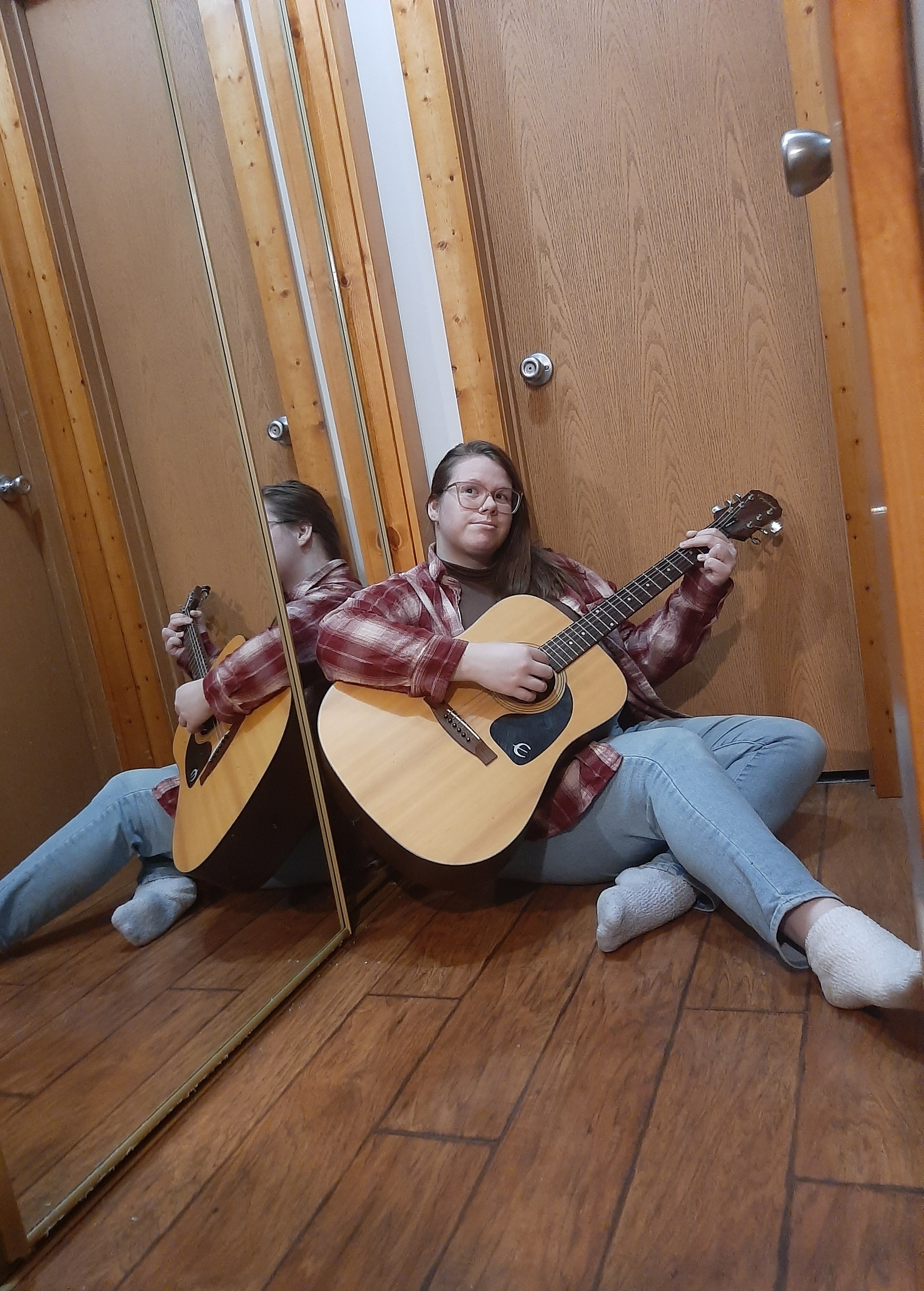 Due to the weather, the guitar I have been using keeps going out of tune. Whenever I pick it up, the low E string has gone close to a full step flat. I didn’t realize the guitar was pretty much in Drop D tuning when I was noodling around melodically. Once I did notice, I tuned it so it was actually in Drop D and kept going. I had created a melodic ostinato that became the backbone of my song. It made it sound like a grungy, early 2000’s song, so I decided to add power chords, because nothing says grunge like power chords. For lyrics, I improvised them on the spot. I kept adding until I found ones that I liked.